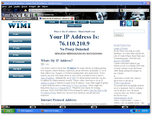 Spoofing IP,hem..membaca judulnya mungkin temen-temen semua berfikiran ini tehnik yang "wah",sebenarnya tidak kok,Spoofing IP bisa juga disebut penyesatan Ip atau menyamarkan Ip dengan memanfaatkan proxy,Hacker sering sekali menggunakan tehnik ini untuk sebelum melakukan aktifitas penyusupan ke website sasaran,melakukan carding,atau apalah sebutan untuk aktifitas itu,dengan melakukan tehnik ini,maka real Ip yang digunakan hacker tidak akan keliatan,karena kita semua pasti tahu bahwasanya setiap kita mengunjungi website manapun,Ip Address kita akan terekam dalam log mereka,bayangkan bila kita melakukan serangan ke website pemerintahan tanpa menyamarkan Ip kita,weits..bisa-bisa kita merasakan dinginnya terali besi penjara.